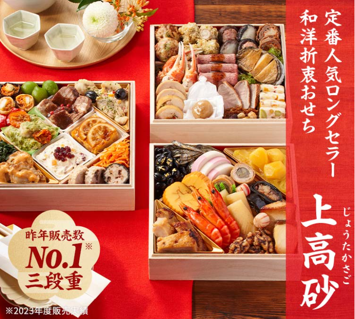 前回(2023/12到着分)は、上慶梅だったので、今回は3~4人前おせちの別種類の上高砂にしてみました。楽しみです♪